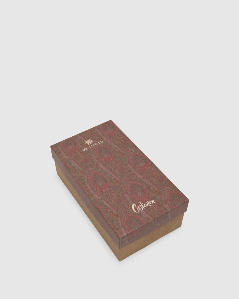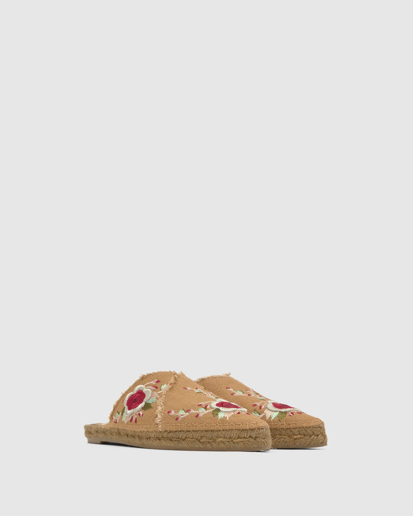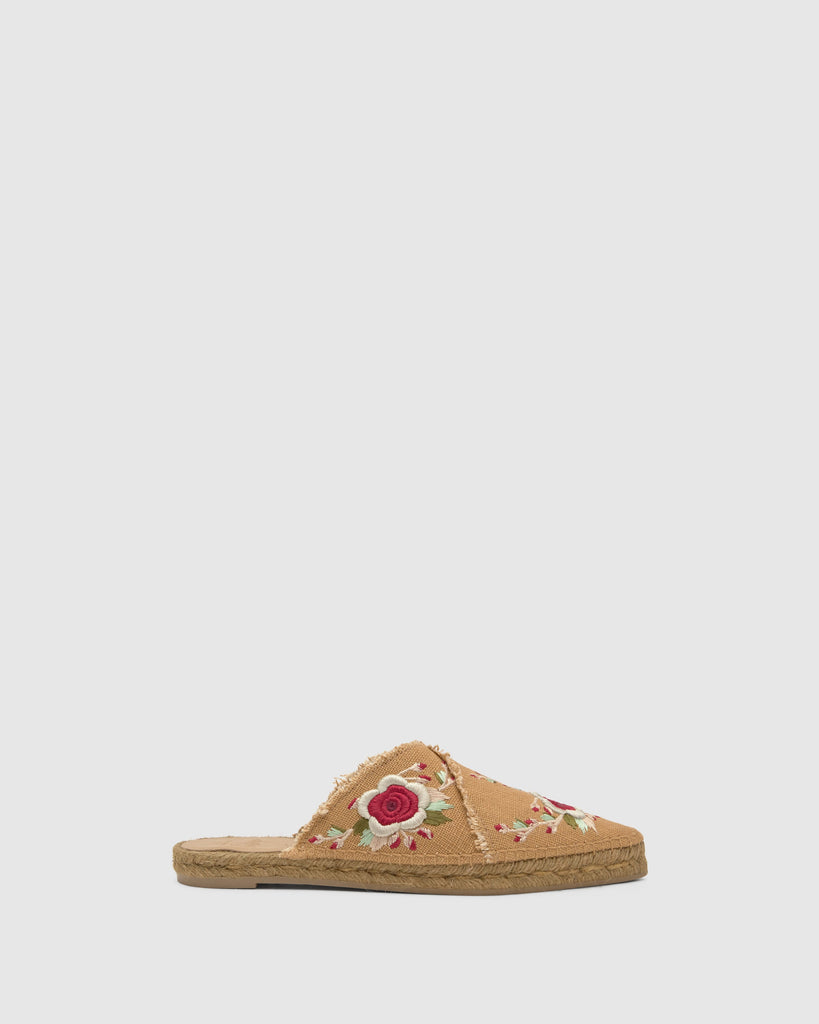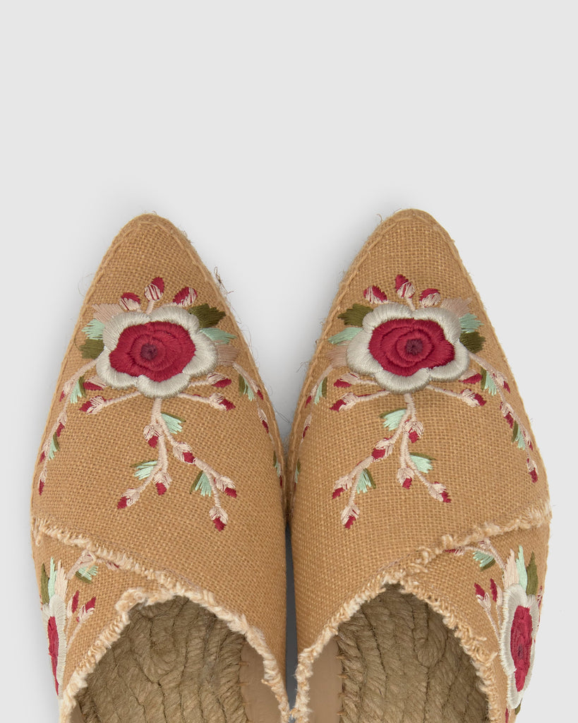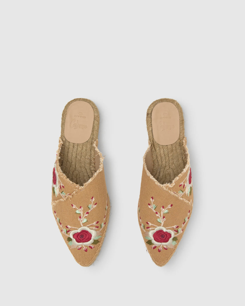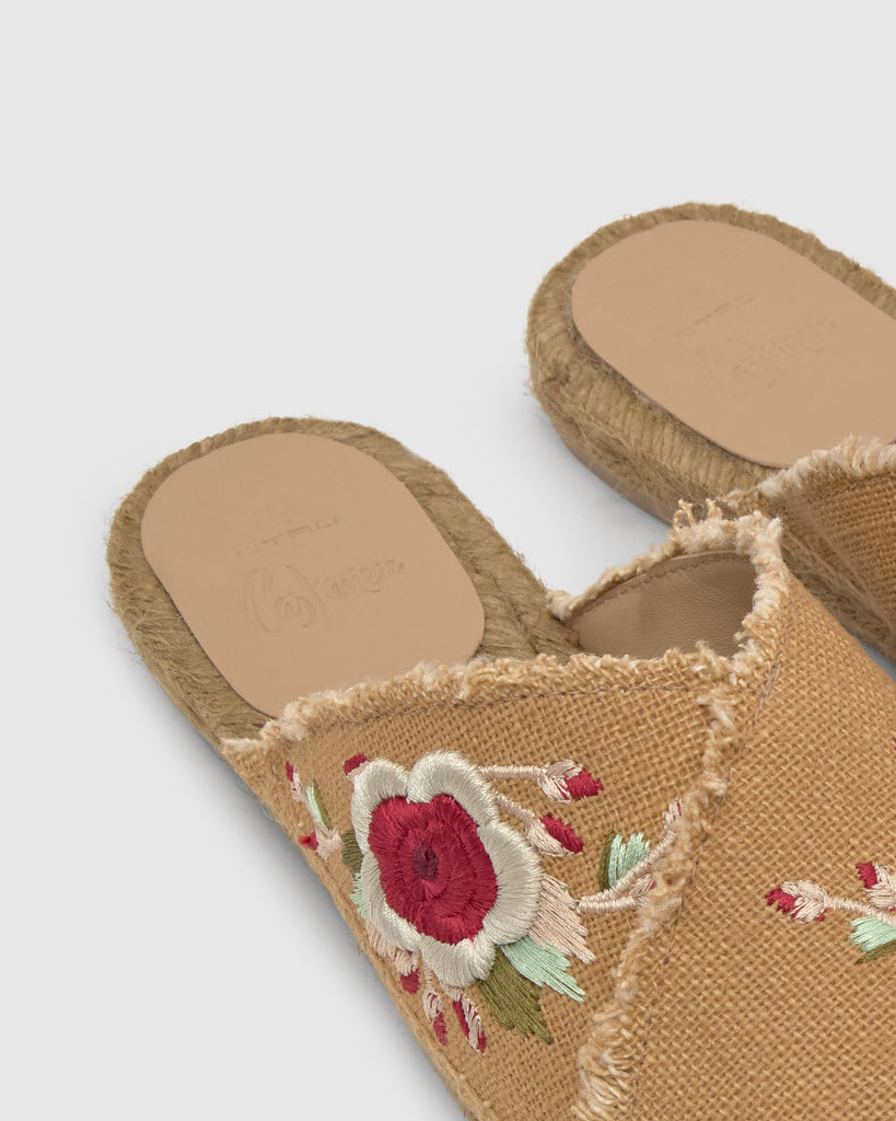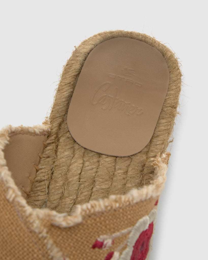 Alpargata plana Rosana estilo babucha en lino con detalle floral bordado diseñado por ETRO y la característica suela de yute taupe de Castañer.