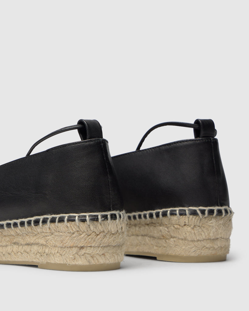 Alpargata bailarina Gea, ahora en napa de cuero de alta calidad. Cuenta con una mini plataforma de 4cm, cierre de cintas de cuero con detalles en las puntas y entresuela de yute natural.