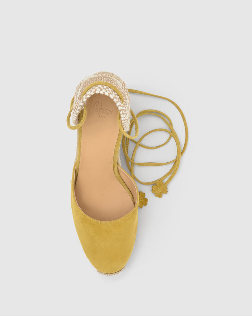 Icónica alpargata Carina en ante con cierre de cordones a juego, plantilla acolchada y cuña de yute de 9 cm.