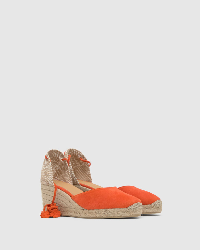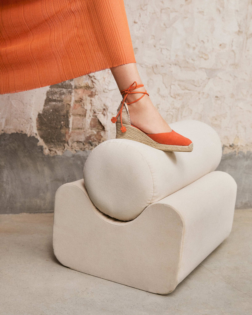 Icónica alpargata Carina en ante con cierre de cordones de ante, plantilla acolchada y cuña de yute de 7 cm.