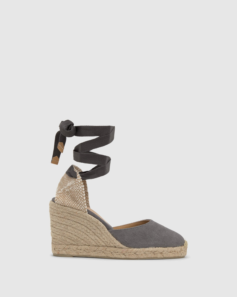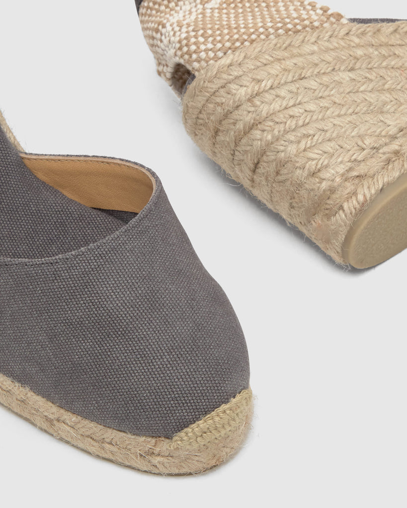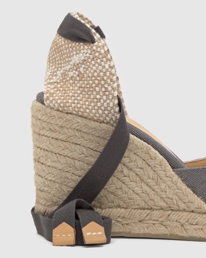 Icónica alpargata Carina en algodón orgánico lavado con cierre de lazo, plantilla acolchada y cuña de yute de 9 cm.