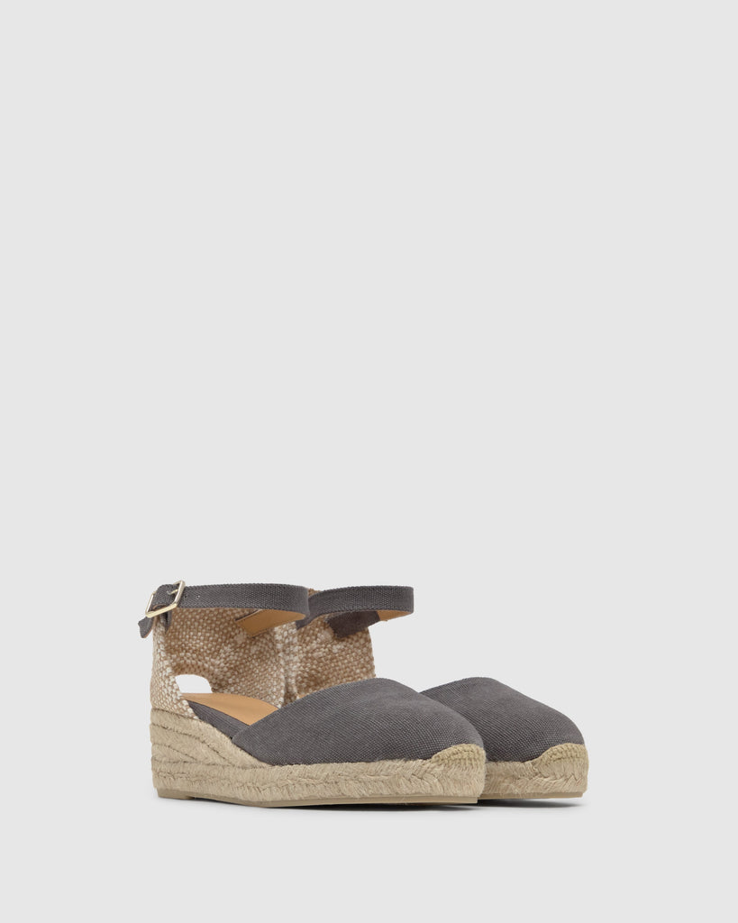 Icónica alpargata Carol en algodón orgánico lavado con cierre de pulsera, plantilla acolchada y cuña de yute de 5 cm.