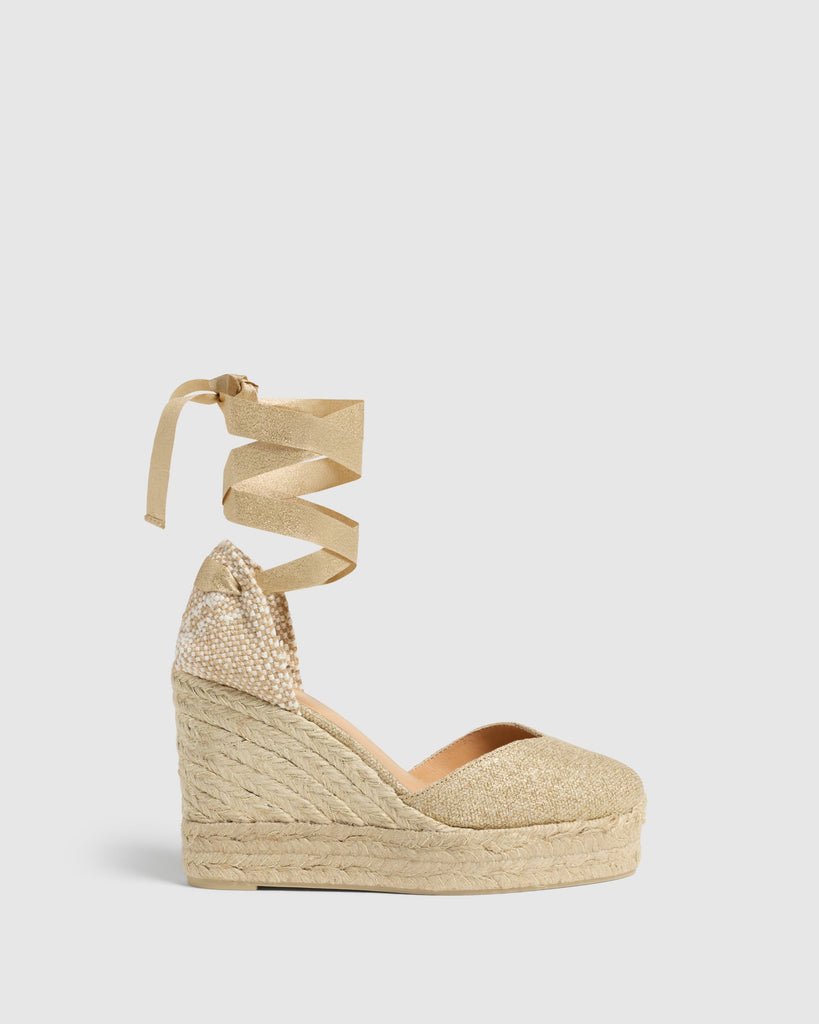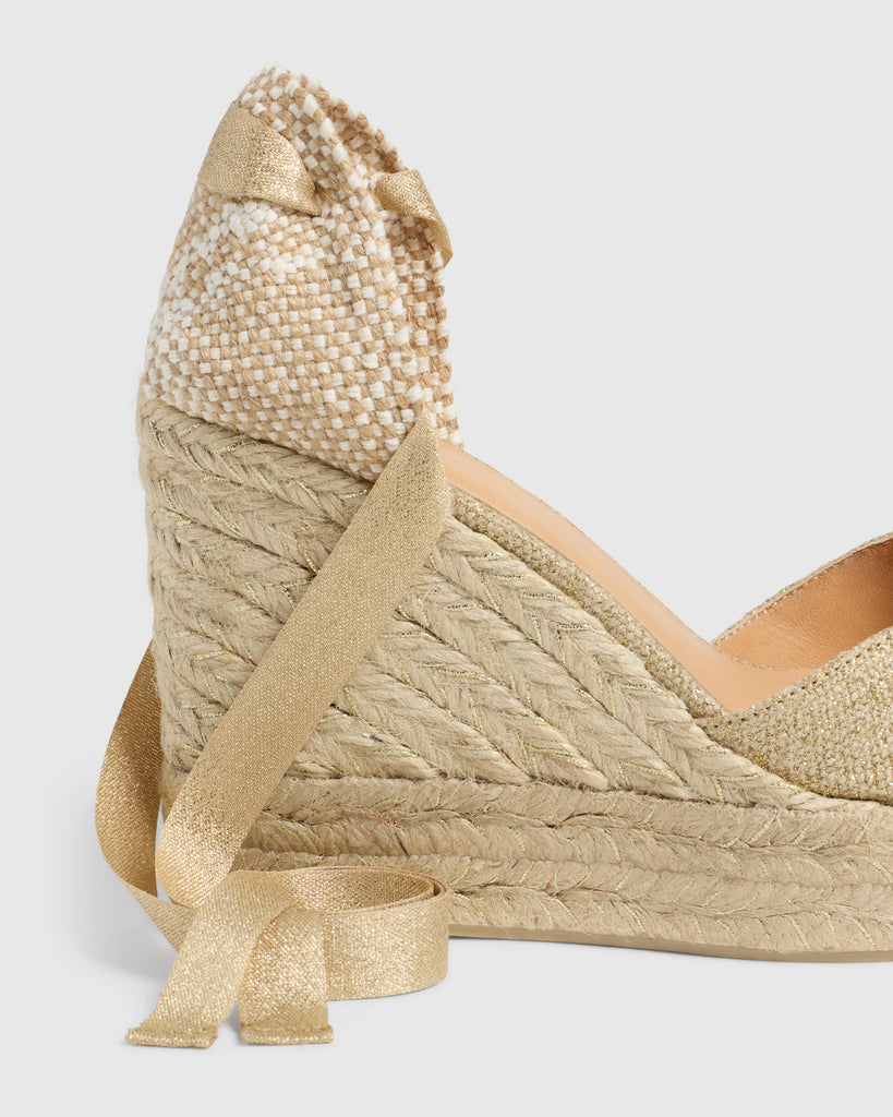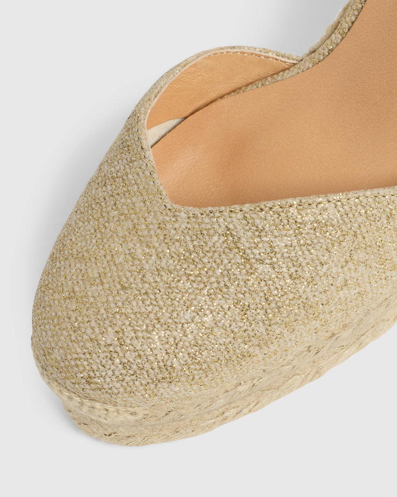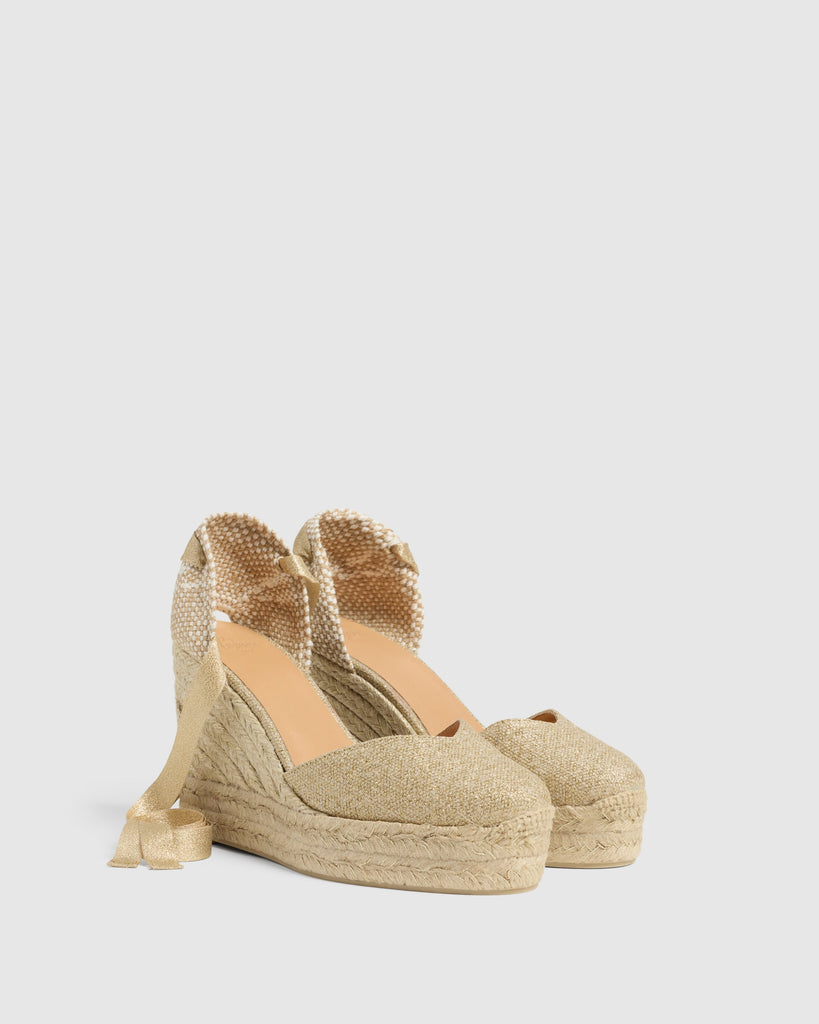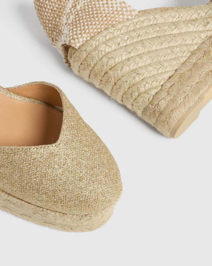 Emana estilo único con Chiara, las icónicas alpargatas que te acompañarán en tus mejores ocasiones. Confeccionadas en España en lino metalizado, las alpargatas Chiara presentan escote a V, puntera cerrada redondeada, cierre mediante lazada, cuña de 11cm con doble plataforma de yute y suela de caucho vulcanizado.