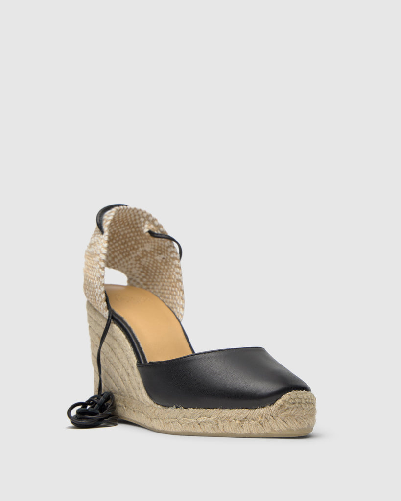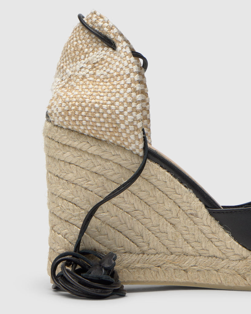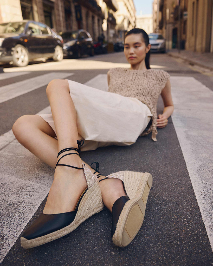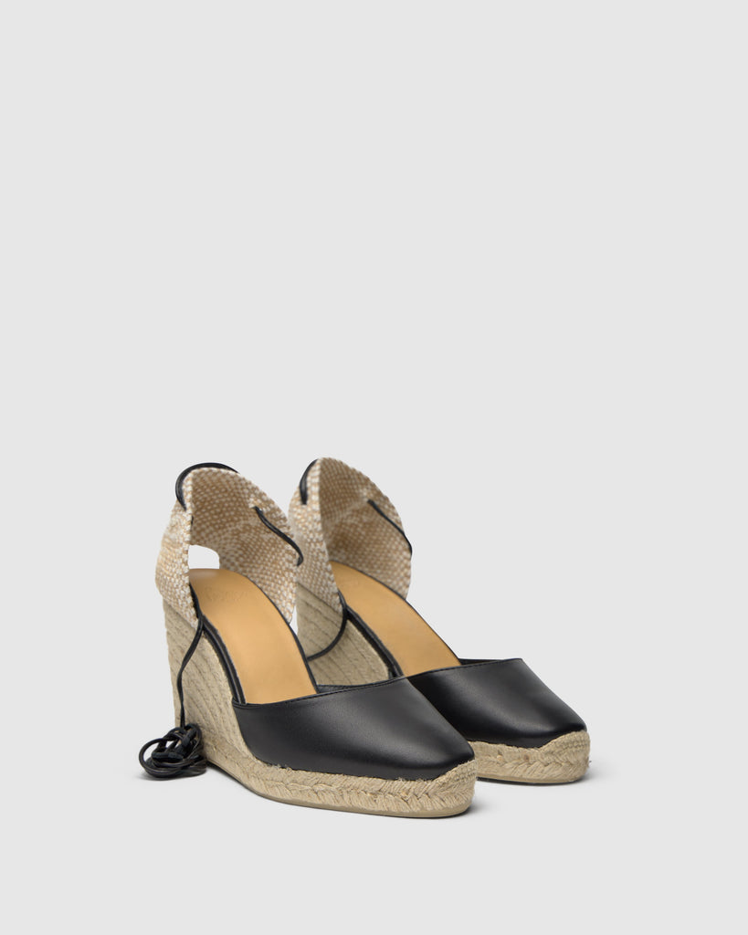 El savoir-faire de Castañer son las alpargatas Carina, reinventadas en napa de cuero de alta calidad. Cuentan con el versátil cierre de cintas de cuero y cuña de yute de 9cm.