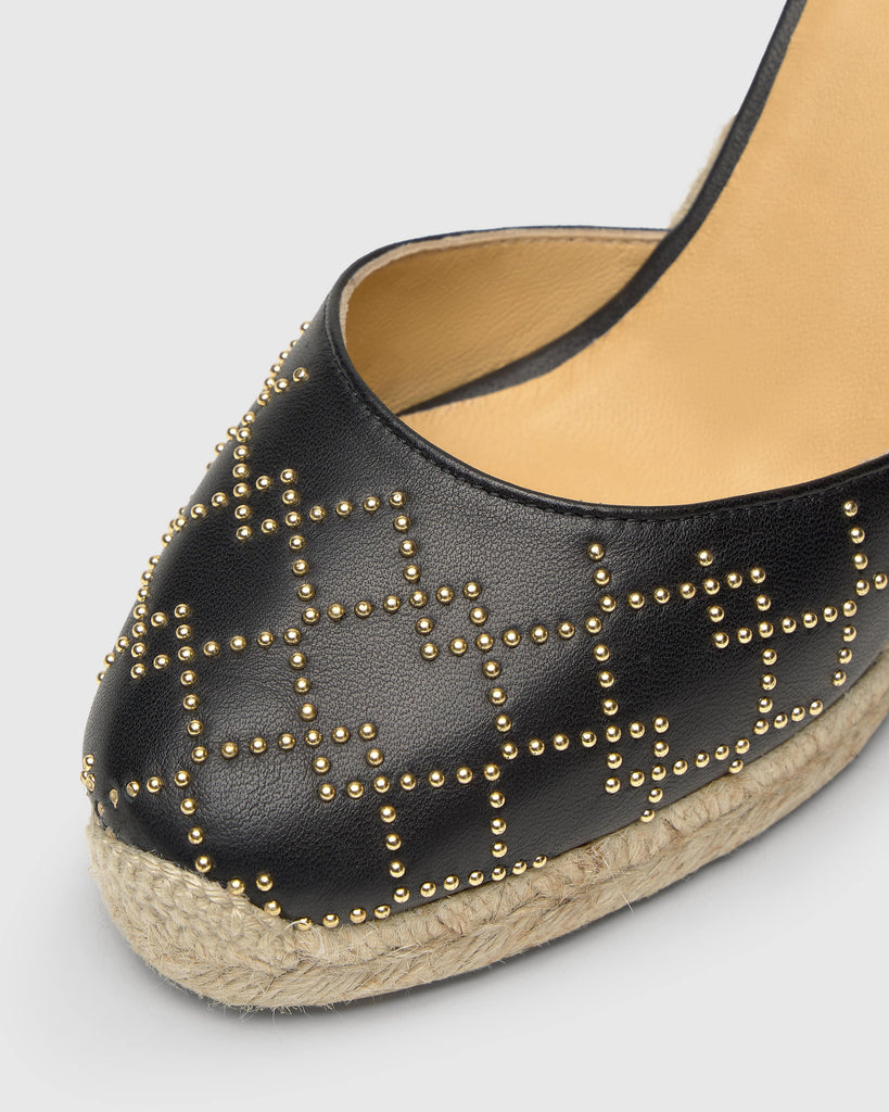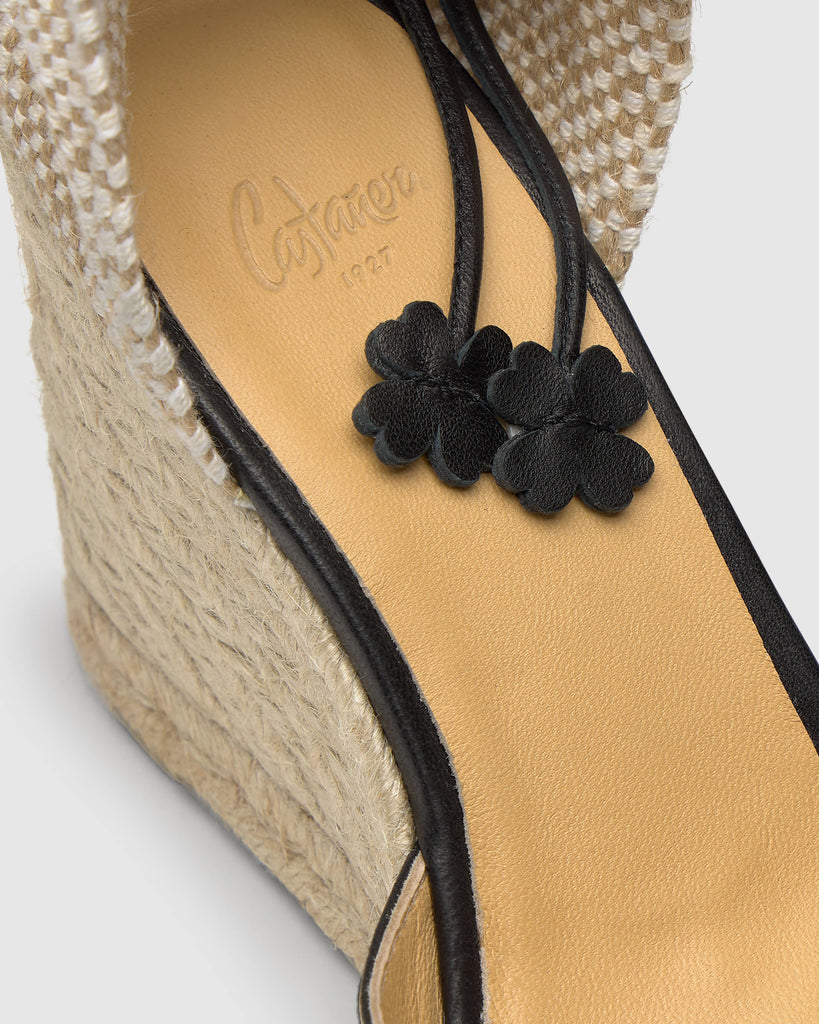 Reinventamos la clásica Castañer Carina en napa de cuero de alta calidad y tachuelas doradas. Mantiene el cierre de cintas tradicional confeccionadas en cuero con detalle en las puntas. Cuenta con cuña de yute natural de 9cm.
