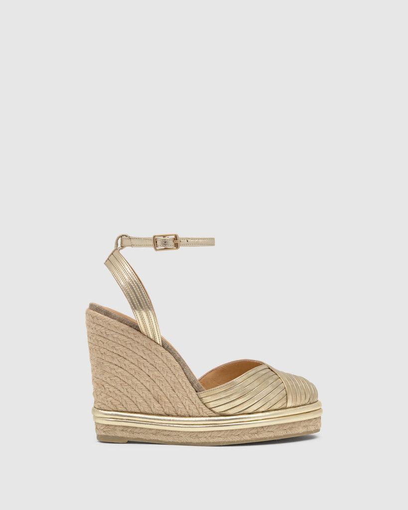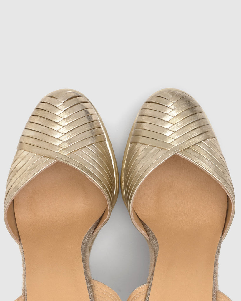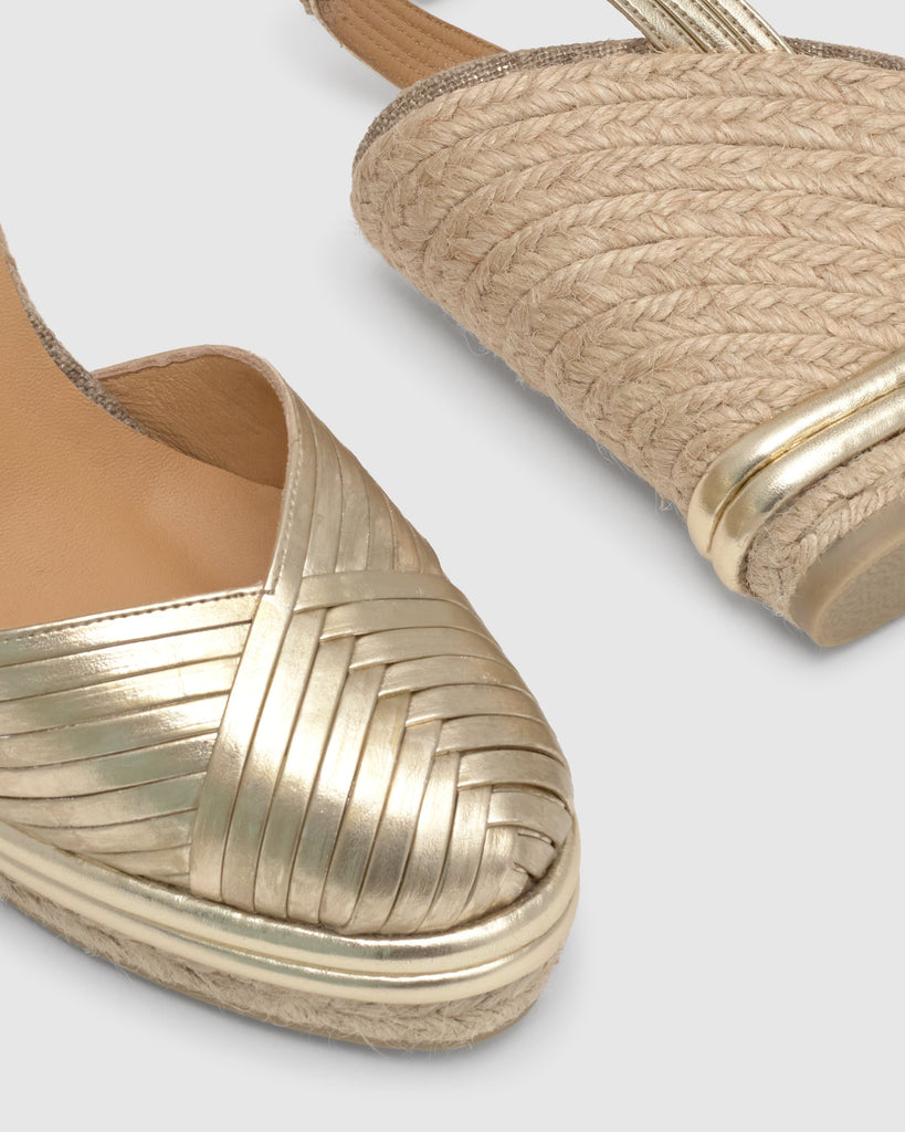Alpargata Colina en piel trenzada con cierre de pulsera y plantilla acolchada. Cuña yute de 13cm con detalle en piel en la plataforma.