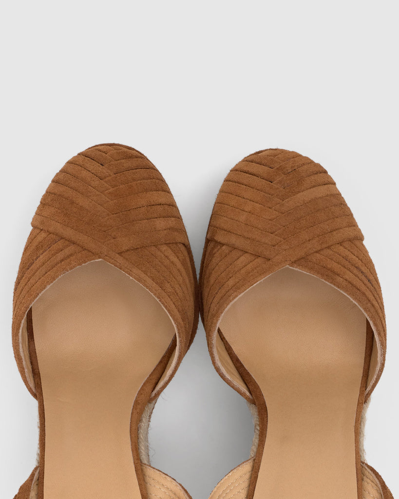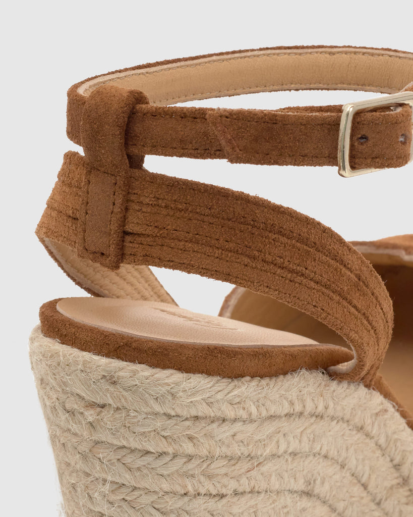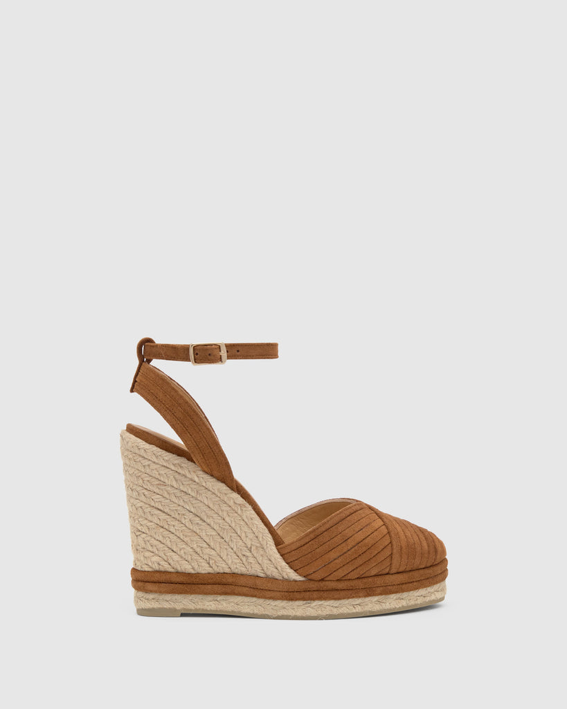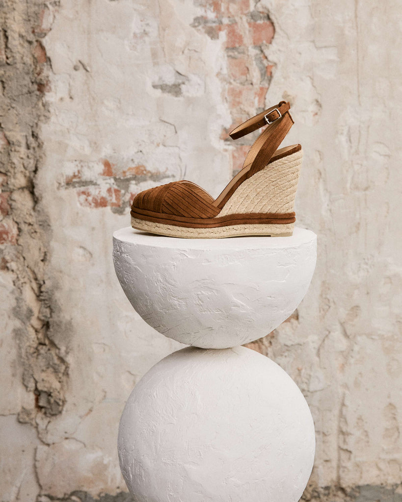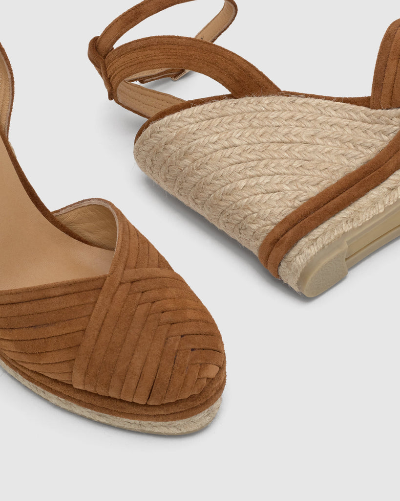 Alpargata Colina en serraje trenzado con cierre de pulsera, plantilla acolchada y escote en V. Cuña de yute de 13cm con detalle en ante en la plataforma.