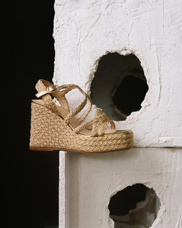 Las sandalias Timotea no pasarán inadvertidas con su detalle trenzado metalizado y suela a tono. Confeccionadas artesanalmente en España, presentan puntera abierta cuadrada, cierre de pulsera lateral con hebilla metálica, abertura en la parte posterior del talón, cuña de 11cm y suela de cuerolite.