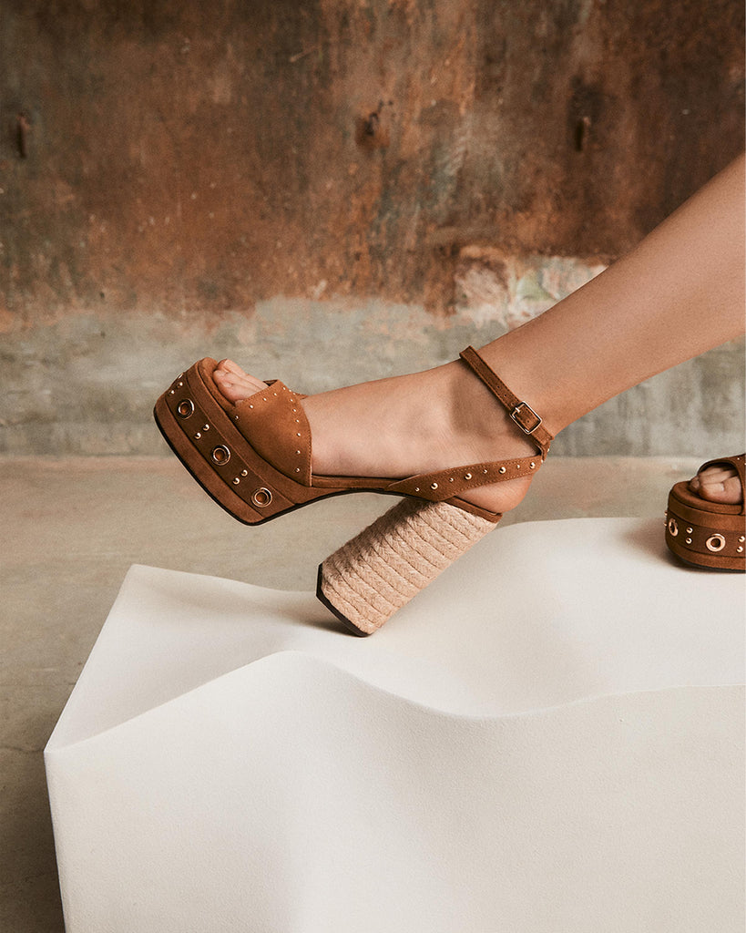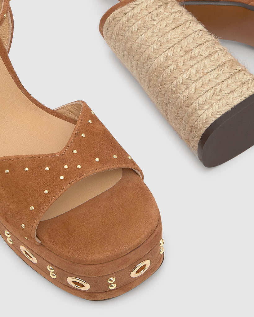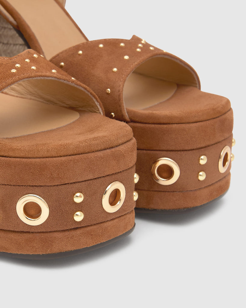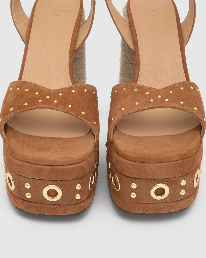 Sandalia Fruamba en ante con cierre de pulsera, plantilla acolchada y tachuelas en el corte y plataforma. Tacón de yute de 13cm.