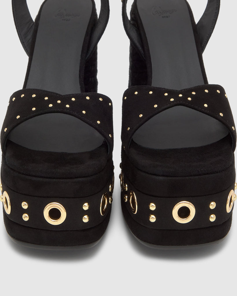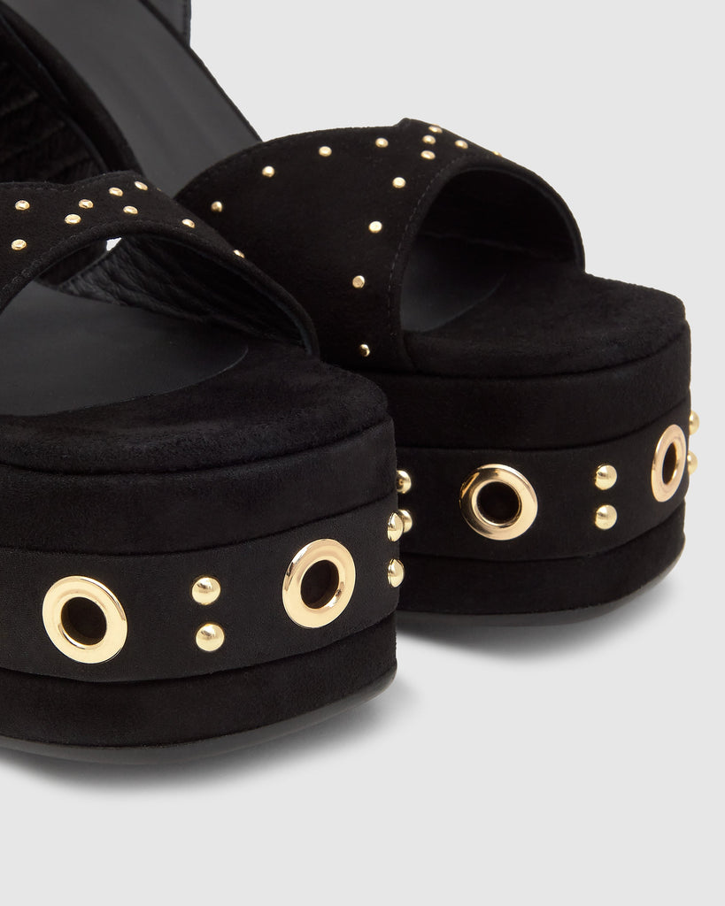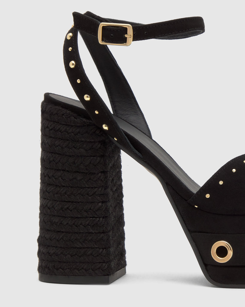 Sandalia Fruamba en ante con cierre de pulsera, plantilla acolchada y tachuelas en el corte y plataforma. Tacón de yute tintado de 13cm.