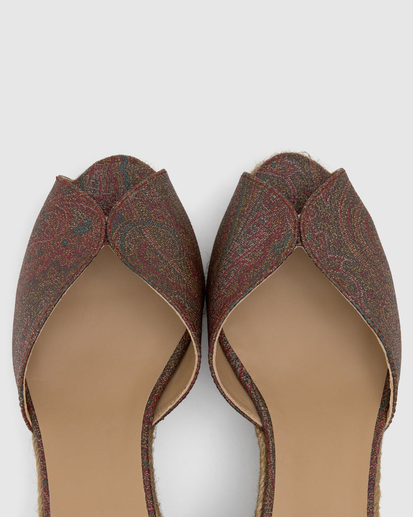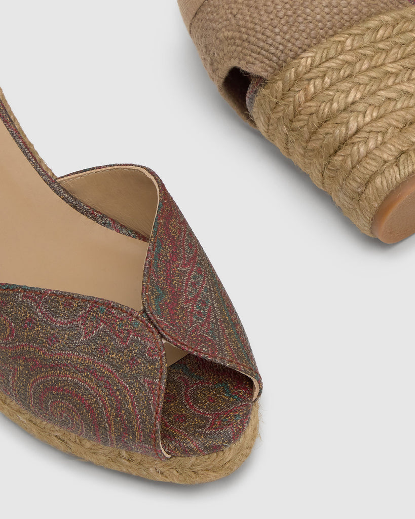 Sandalia Bilina en el icónico tejido jacquard de ETRO con acabado engomado, cierre de cintas, plantilla acolchada y cuña de yute taupe de 7cm.