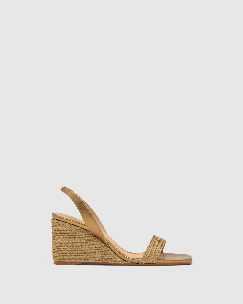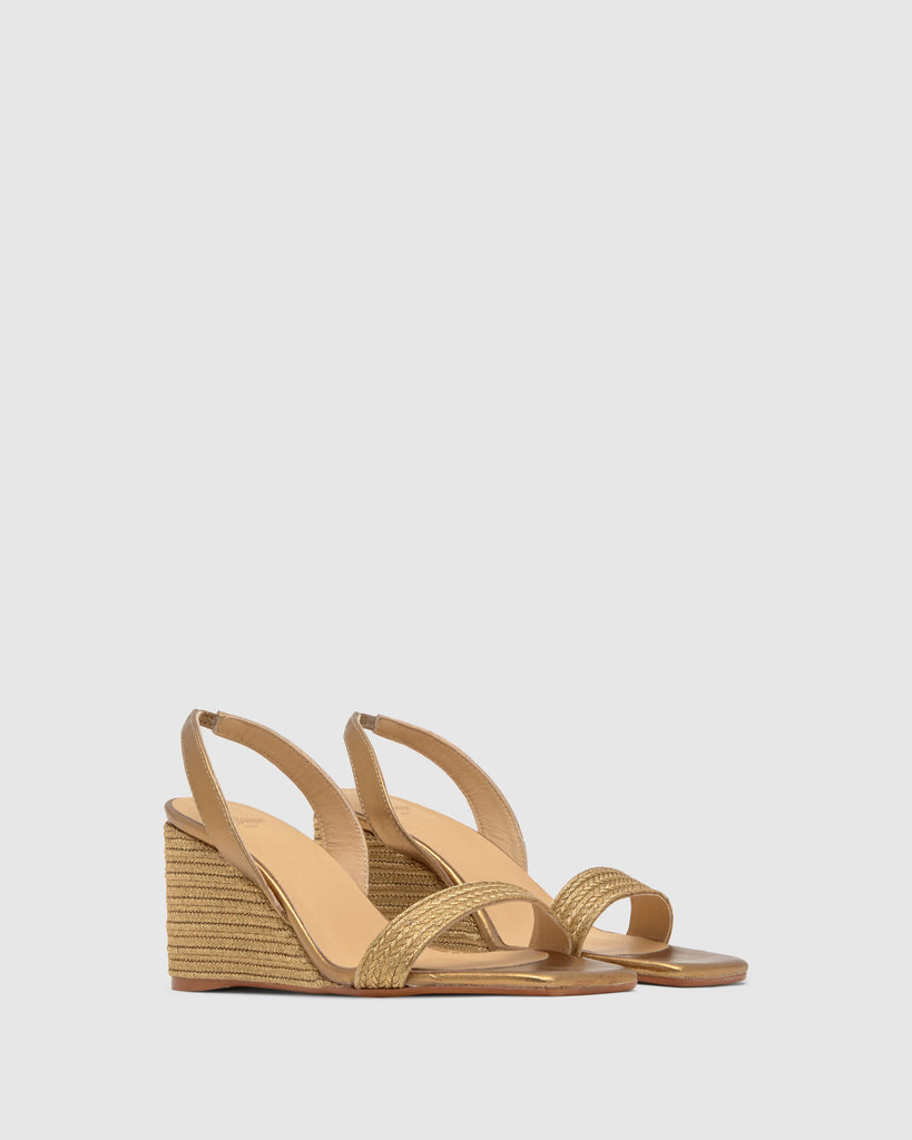 Sandalia Barby destalonada con trenzado metalizado artesanal, plantilla acolchada y cuña de 8cm forrada a juego.