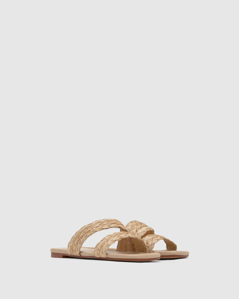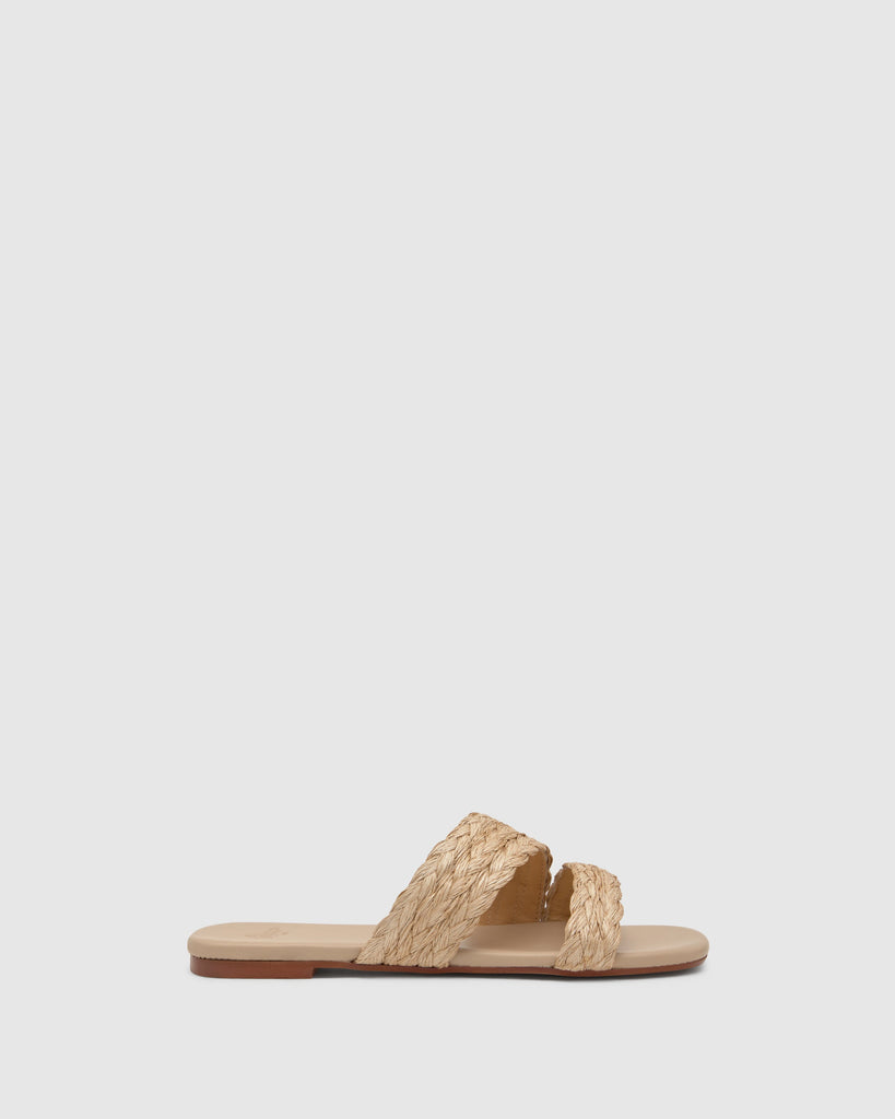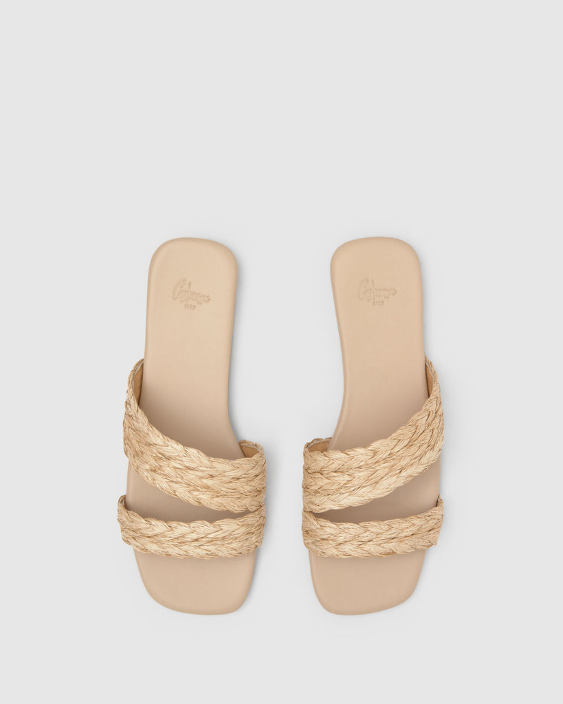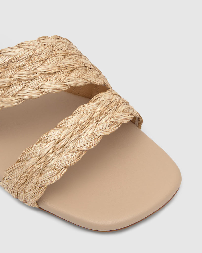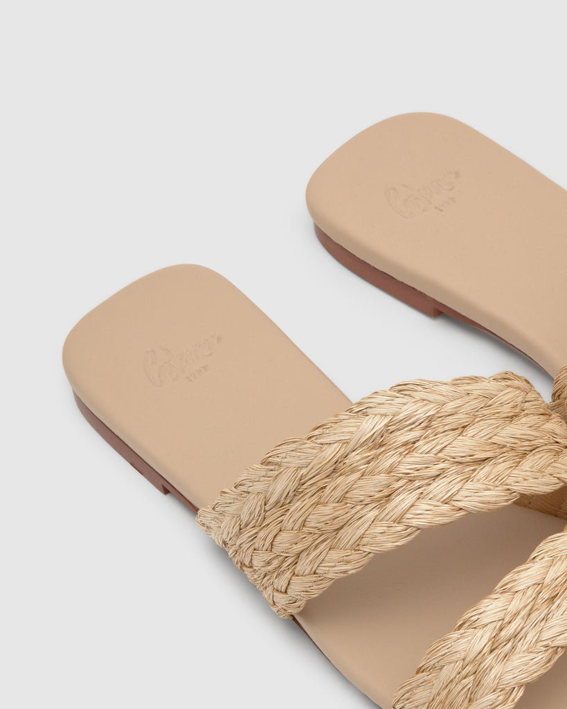 Sandalia plana slip-on Paz en rafia trenzada con plantilla acolchada y suela de cuerolite.